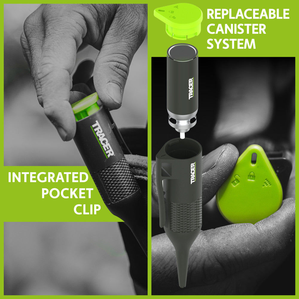 The TRACER Trueshot Chalk Marker Kit is a next-gen deep-hole marking tool, designed for pinpoint chalk marking from 0mm to 100mm in depth. With its simple point-and-spray action, the Trueshot Chalk Marker delivers a highly accurate cross mark when held directly to any surface. Features 250-shot replaceable chalk canister, 3-stage locking function (spray, lock, replace), tough ABS profile, tapered barrel, pocket clip and lanyard hole.